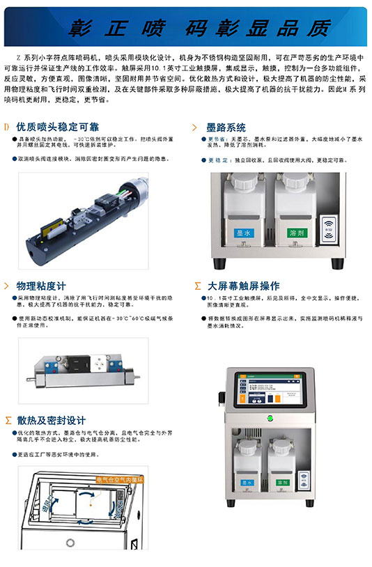 Z系列小字符點(diǎn)陣噴碼機(jī),噴頭采用模塊化設(shè)計(jì),機(jī)身為不銹鋼構(gòu)造堅(jiān)固耐用,可在嚴(yán)苛惡劣的生產(chǎn)環(huán)境中可靠運(yùn)行并保證生產(chǎn)線的工作效率。觸屏采用10.1英寸工業(yè)觸摸屏,集成顯示,觸摸,控制為一臺(tái)多功能組件,反應(yīng)靈敏,方便直觀,圖像清晰,堅(jiān)固耐用并節(jié)省空間。優(yōu)化散熱方式和設(shè)計(jì),極大提高了機(jī)器的防塵性能,采用物理粘度和飛行時(shí)間雙重檢測,及在關(guān)鍵部件采取多種屏蔽措施,極大提高了機(jī)器的抗干擾能力。因此Z系列噴碼機(jī)更耐用,更穩(wěn)定,更節(jié)省。